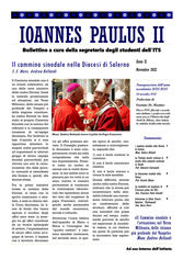 “Ioannes Paulus II” è il bollettino promosso dalla Segreteria degli Studenti dell’Istituto Teologico Salernitano. Esso nasce all’inizio dell’A.A. 2021-2022, dando seguito ad un desiderio degli studenti e della Segreteria dell’Istituto stesso, in accordo con il regolamento interno. L’art. 11 di quest’ultimo indica anche le finalità del bollettino: